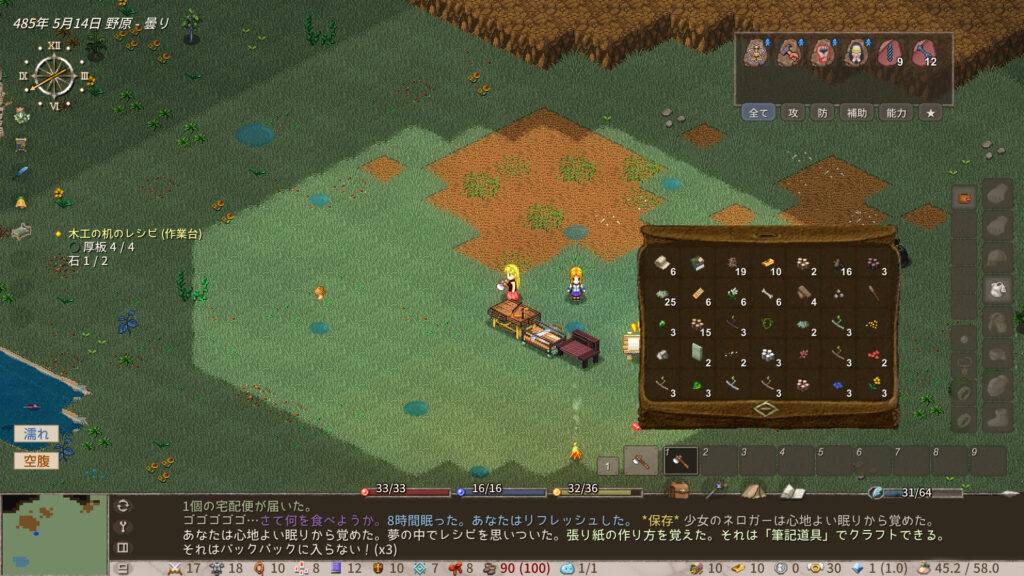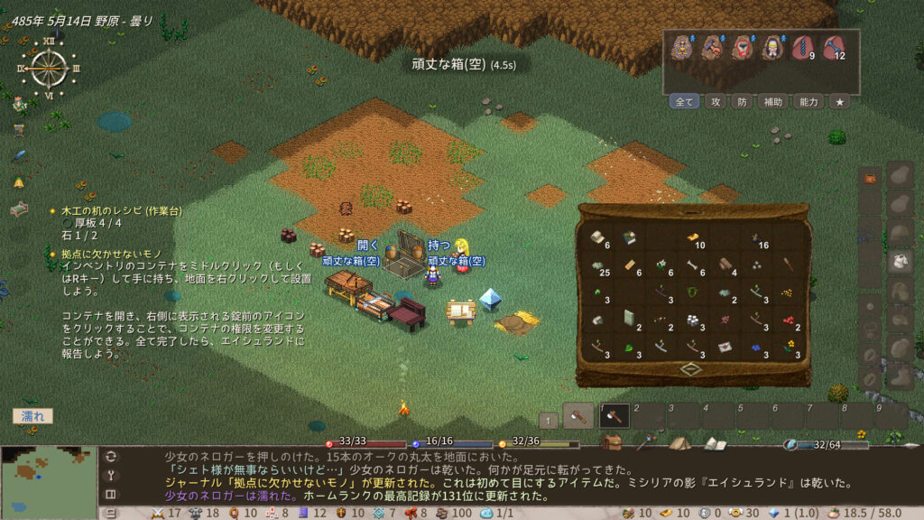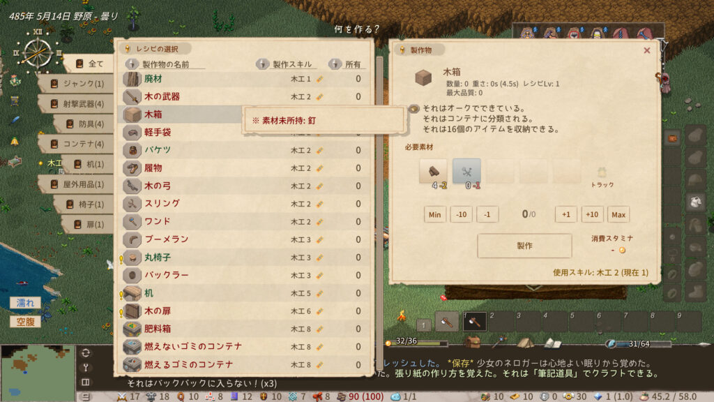 バックパックいっぱいになったんだけど、釘がなくて木箱を作れないんだよな…。ネロガー餓死しそうになってるし